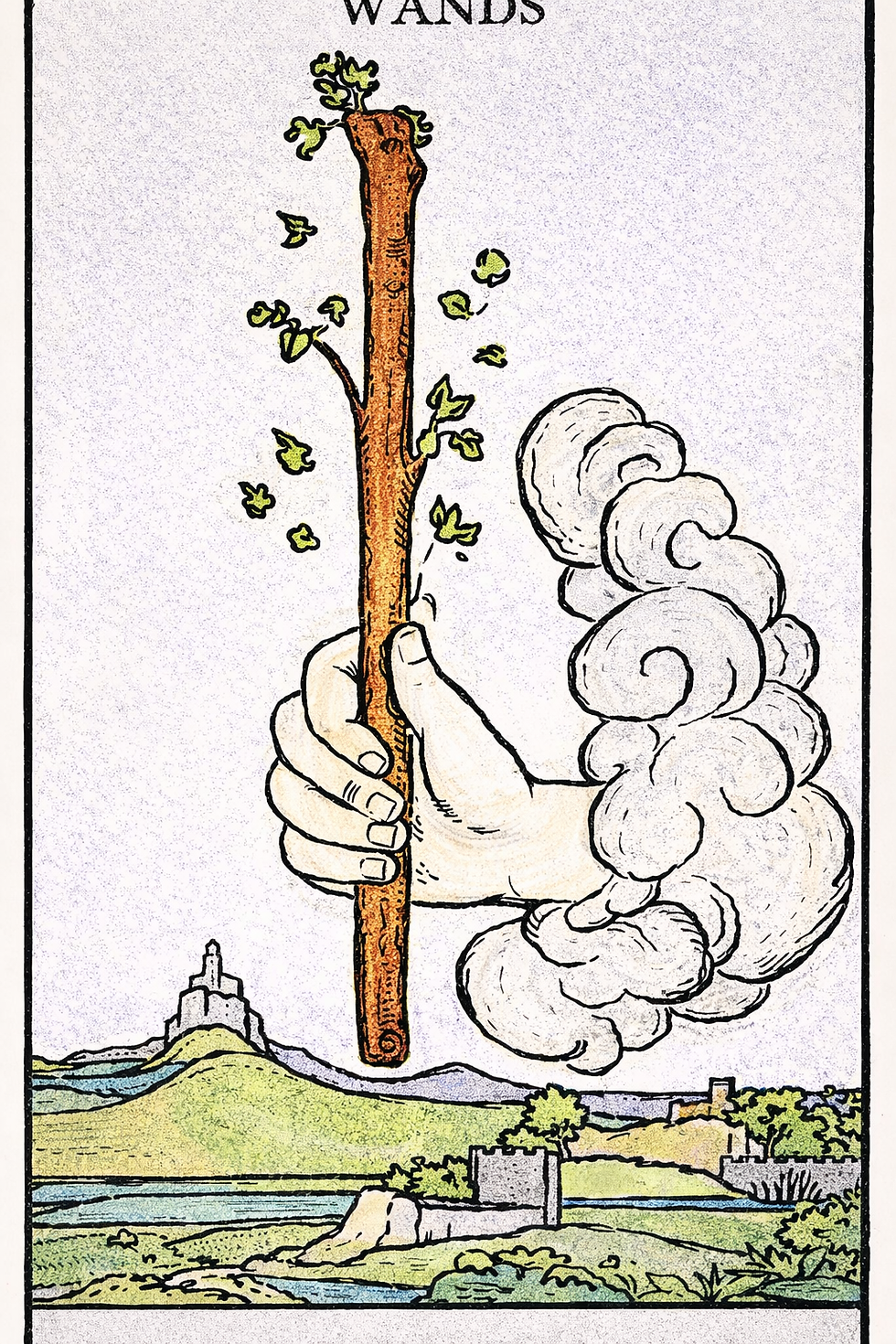 Image: Ace of Wands from the Rider–Waite–Smith Tarot (1909 edition), illustrated by Pamela Colman Smith. Public domain.